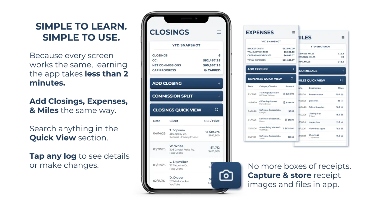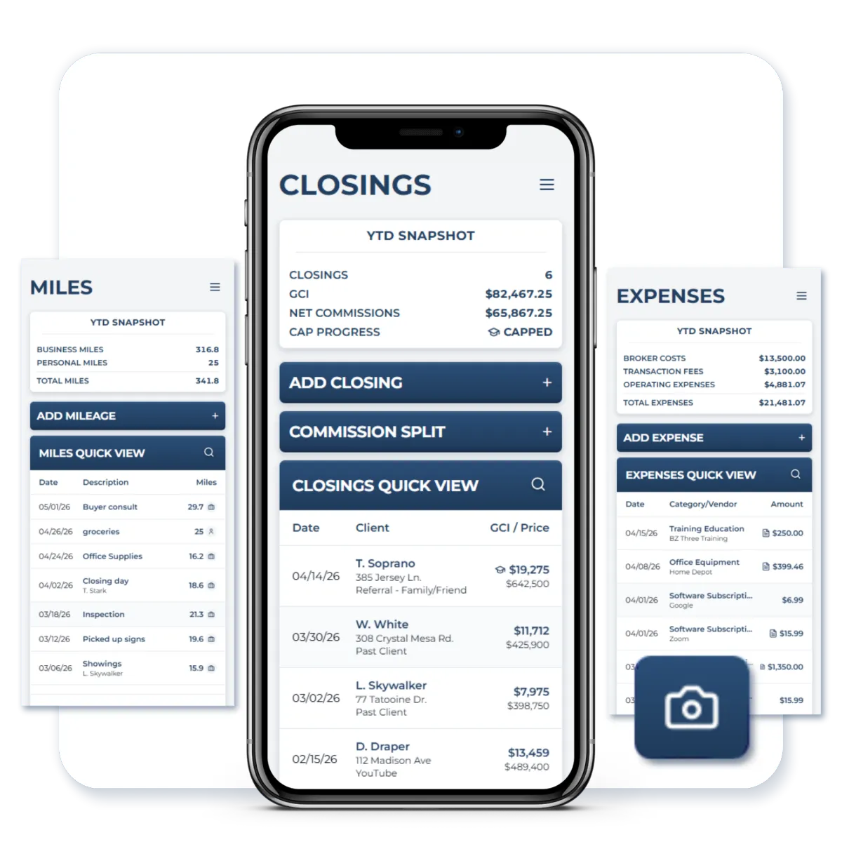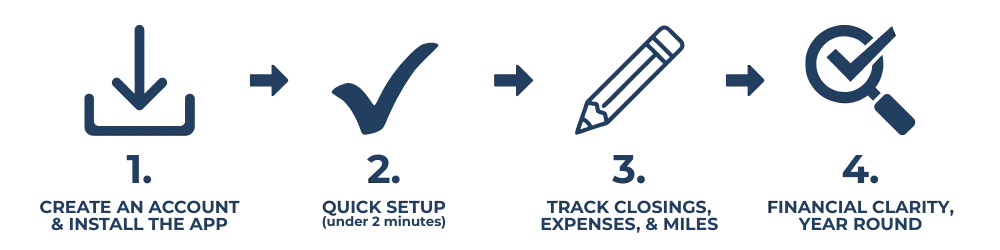 Stop mix and matching apps to track your real estate business financials! Instead, track closings, expenses, and miles in one app that's convenient and easy to use.